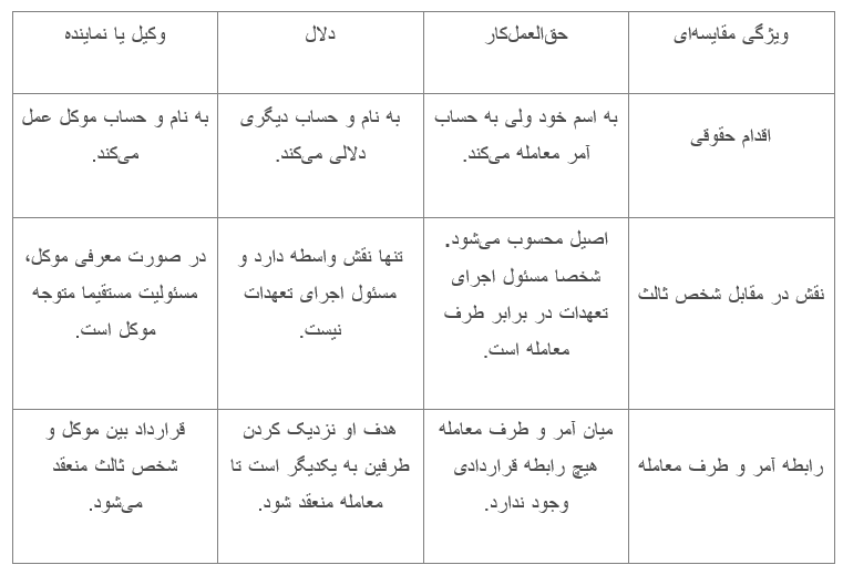 حقالعملکاری در قوانین ایران شکلی تخصصی از واسطهگری تجاری محسوب میشود. این مفهوم، تفاوتهای مهمی با مفاهیم حقوقی مشابه دارد. در این بخش، به بررسی تفاوت حقالعملکار با وکیل، نماینده و دلال میپردازیم.