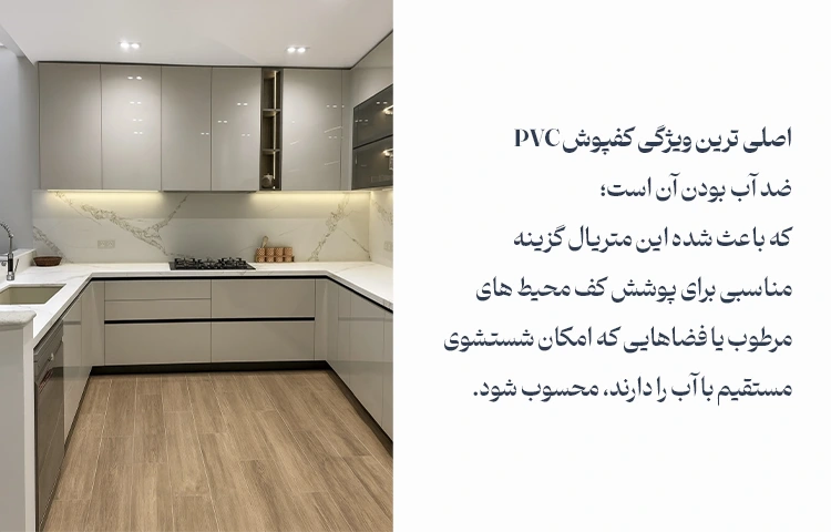 در فضاهای مرطوب یا در محیط هایی که امکان تماس مستقیم با آب وجود دارد؛ مانند آشپزخانه و مراکز بهداشتی، کفپوش های از جنس پی وی سی به دلیل مقاومت بالا در برابر آب و رطوبت گزینه معقول و مناسب تری به شمار می روند.