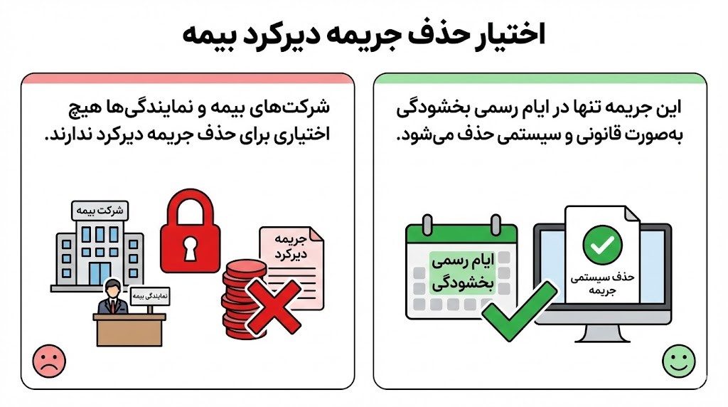 سیستم صدور بیمهنامه بهصورت سراسری و متمرکز طراحی شده و تا زمانی که جریمه دیرکرد تسویه نشود، امکان صدور بیمه وجود ندارد. تنها بازهای که این جرایم بهصورت کاملاً قانونی و سیستمی حذف میشوند، ایام رسمی بخشودگی اعلامشده توسط بیمه مرکزی است. بنابراین هرگونه وعده حذف جریمه خارج از این طرح، غیرواقعی و غیرقانونی است.